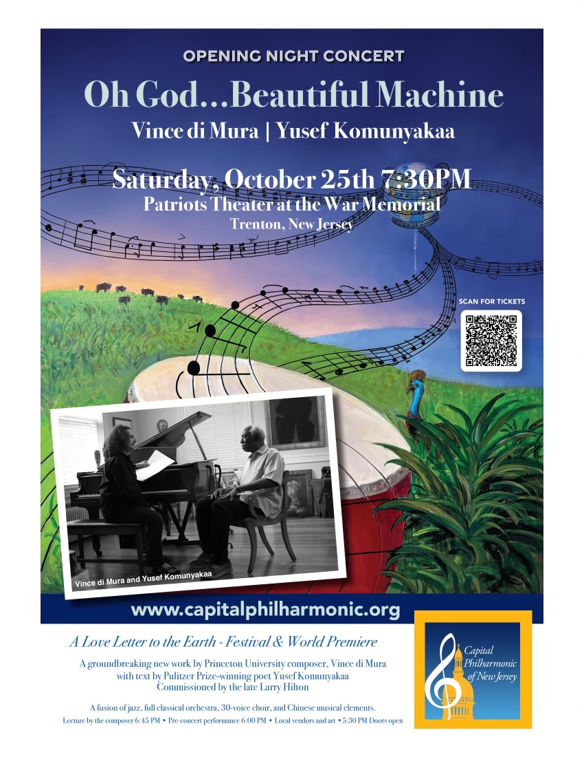Trenton, NJ – The Capital Philharmonic of New Jersey (CPNJ) proudly presents the world premiere of Oh God…Beautiful Machine, a monumental symphonic jazz work which wrestles with the conundrum of loving the earth in a time of climate change. The collaboration features text composed by Pulitzer Prize-winning poet Yusef Komunyakaa and music composed by Princeton University Composer-in-Residence, Vince di Mura.