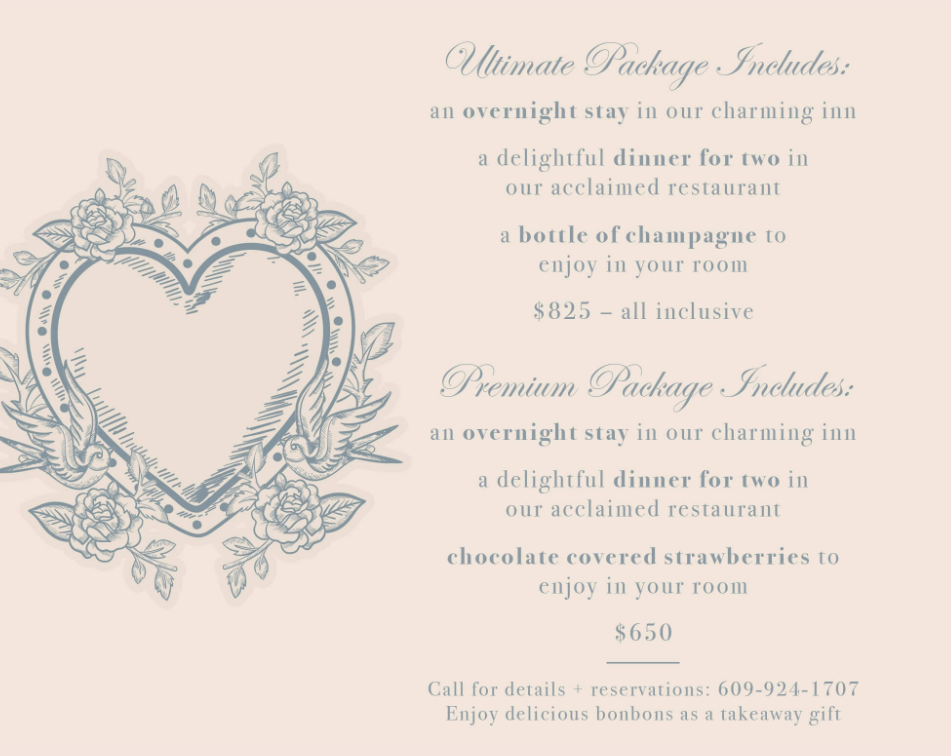 Space is limited for these exclusive packages. To book your romantic escape, please call us at 609-924-1707.